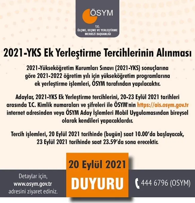 ÖSYM tarafından yapılan bilgilendirmede Ek yerleştirme işlemleri 2021-Yükseköğretim Kurumları Sınavı Kılavuzu 2021-YKS Yükseköğretim Programları ve Kontenjanları Kılavuzu ile 2021-YKS Yükseköğretim Programlarına Ek. 2021 YKS ikinci tercihleri 20 Eylül Pazartesi günü saat 1000da başlayacak ve 23 Eylül Perşembe saat 2359da sona erecek.